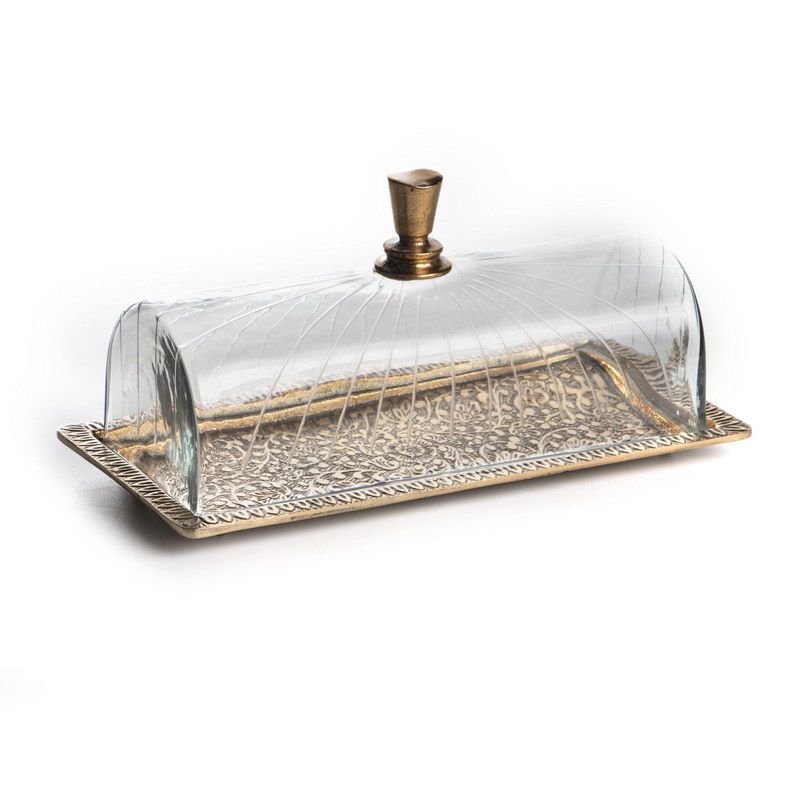 מגש מלבני ערבסק אלומיניום זהב ופעמון זכוכית שקוף 37/17.5 ס"מ גובה 17.5 ס"מ