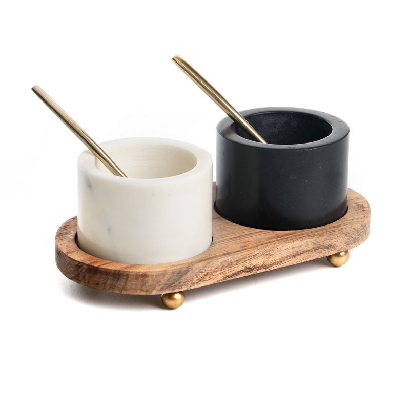 זוג מלחיות פתוחות שיש וכפיות זהב על מגש עץ כהה 20/10 גובה 8 ס"מ