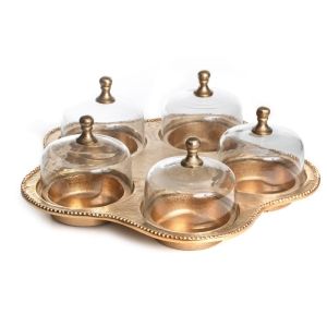 סט 5 קעריות הגשה מתכת זהב על בסיס עץ עגול עם 5 פעמוני זכוכית קוטר 31.5 גובה 13 ס"מ