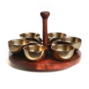 6 קעריות הגשה מתכת זהב על בסיס עץ עגול קוטר 39.5 גובה 25 ס"מ