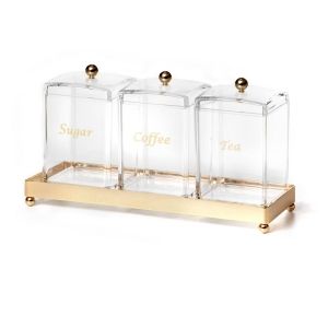 סט תה קפה סוכר מרובע שקוף על מגש מראה זהב 30/11 גובה 28 ס"מ