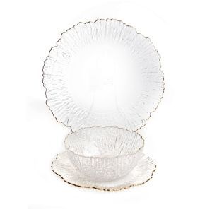 מערכת אוכל זכוכית 18 חלקים גבישי Kim שקופה פס זהב שוליים מחוספסים קוטר 27/21/16.5 ס"מ צלחת למרק עומק 4.8 ס"מ
