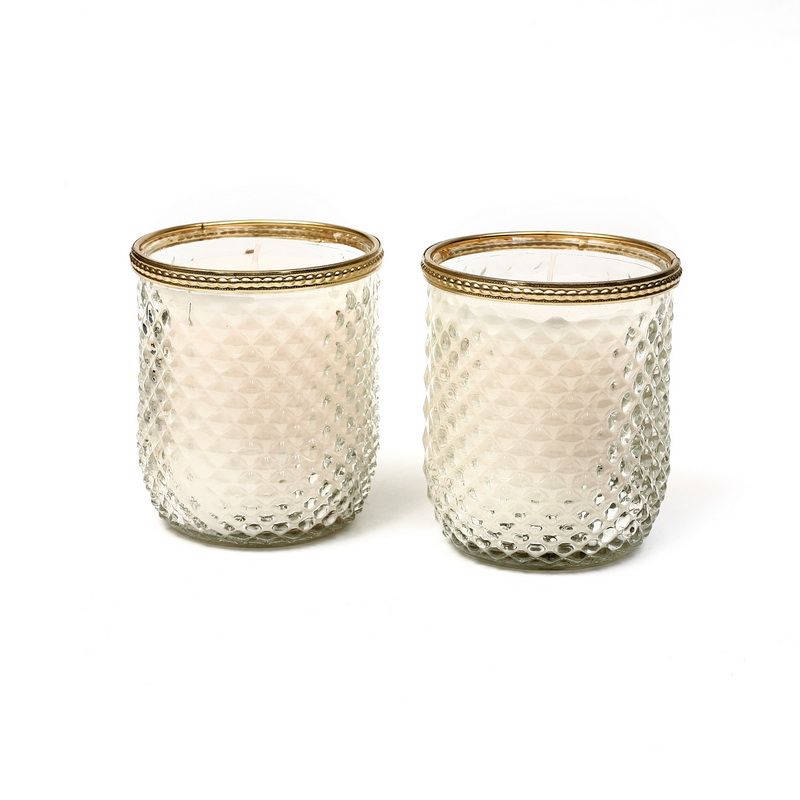 זוג נרות ונילה זכוכית פרמידה בעיטורי זהב מבית המותג נובל קולקשיין. מתאים כאקססוריז לבית