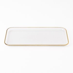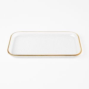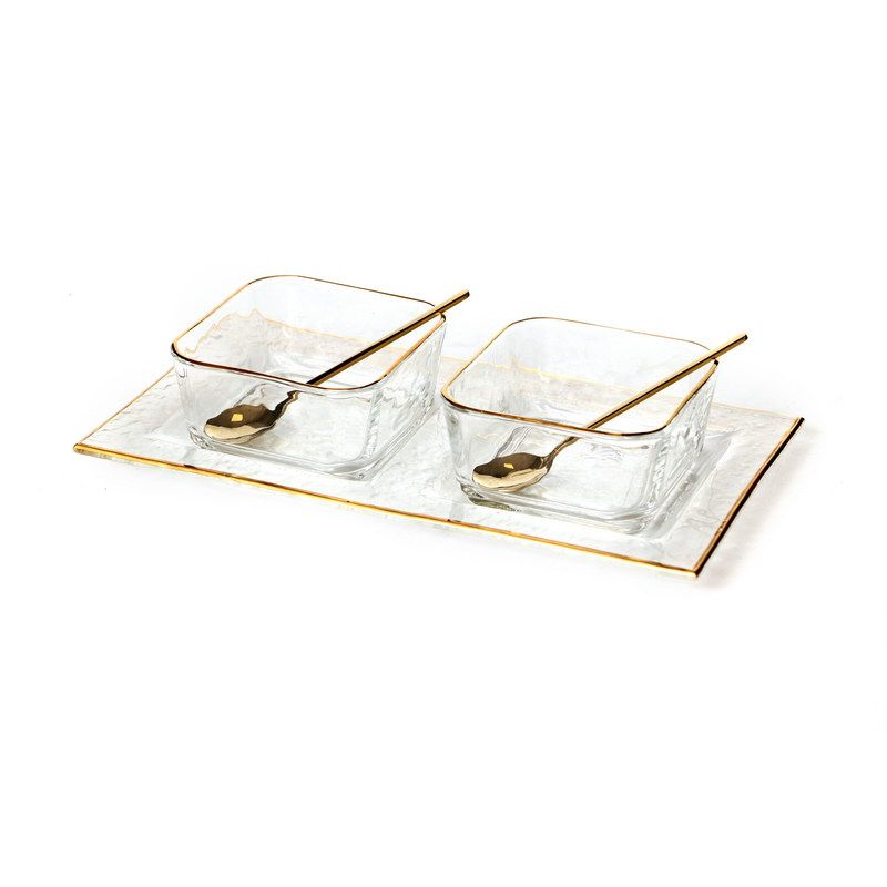 זוג קעריות על מגש גבישי ריבוע זכוכית שקופה פס זהב וכפיות 27.5/14.5 ס"מ עומק 5.5 ס"מ