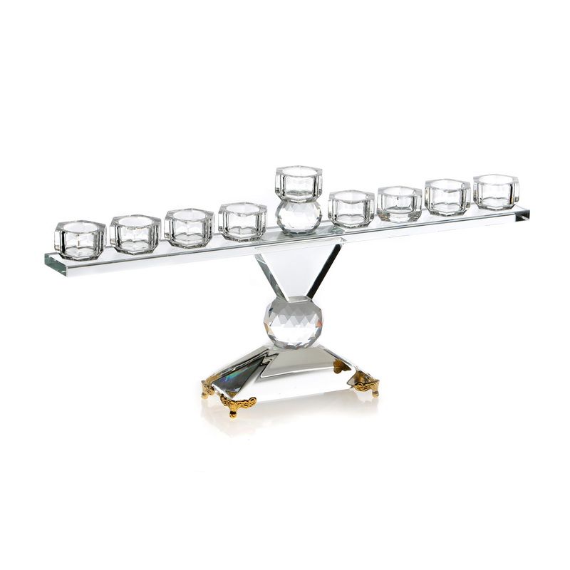 חנוכיית קריסטל עומדת על ארבעה רגליים מזהב מבית המותג חושן.