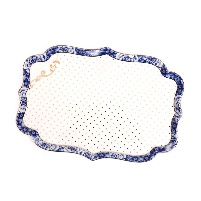 מגש אירוח מלבני בעיצוב פרחוני כחול ועיטורי זהב מנוקדים מסדרת Royal White. משמש לאירוח ולהגשת מזון חם וקר. יכול לשמש כאקססורי לעיצוב הבית.