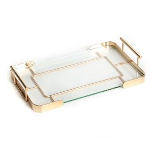 מגש זכוכית עגול ידיות מתכת זהב קוטר 36 ס"מ גובה 5 ס"מ