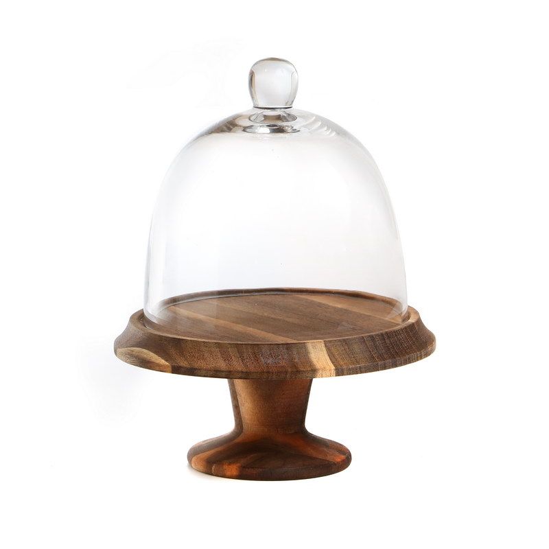 מגש עץ על רגל ופעמון זכוכית שקוף גובה 24.5 קוטר 19.5 ס"מ