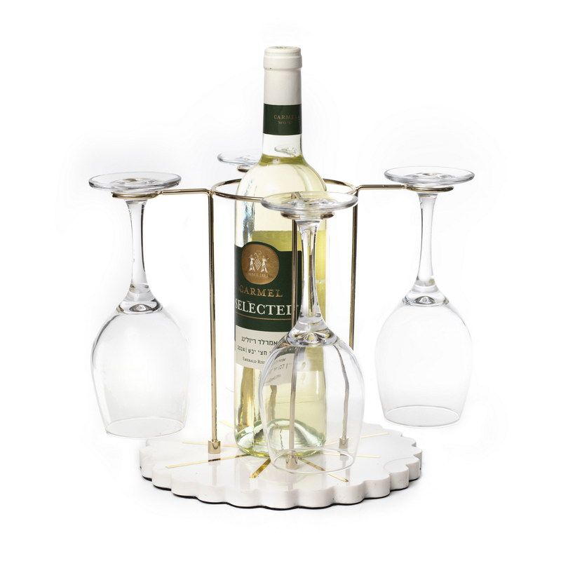 מעמד לבקבוק יין ול 4 גביעים (כלולים) מתכת זהב בסיס שיש לבן 30/30 גובה 22 ס"מ