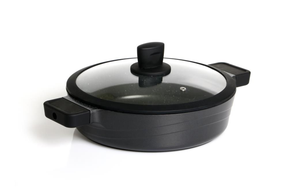 סוטאז שחור מכסה זכוכית ידית שחורה קוטר 28 גובה 7.5 ס"מ יציקת אלו. 2 שכבות שיש /חוץ-טפלון קוצ'ינה מיה