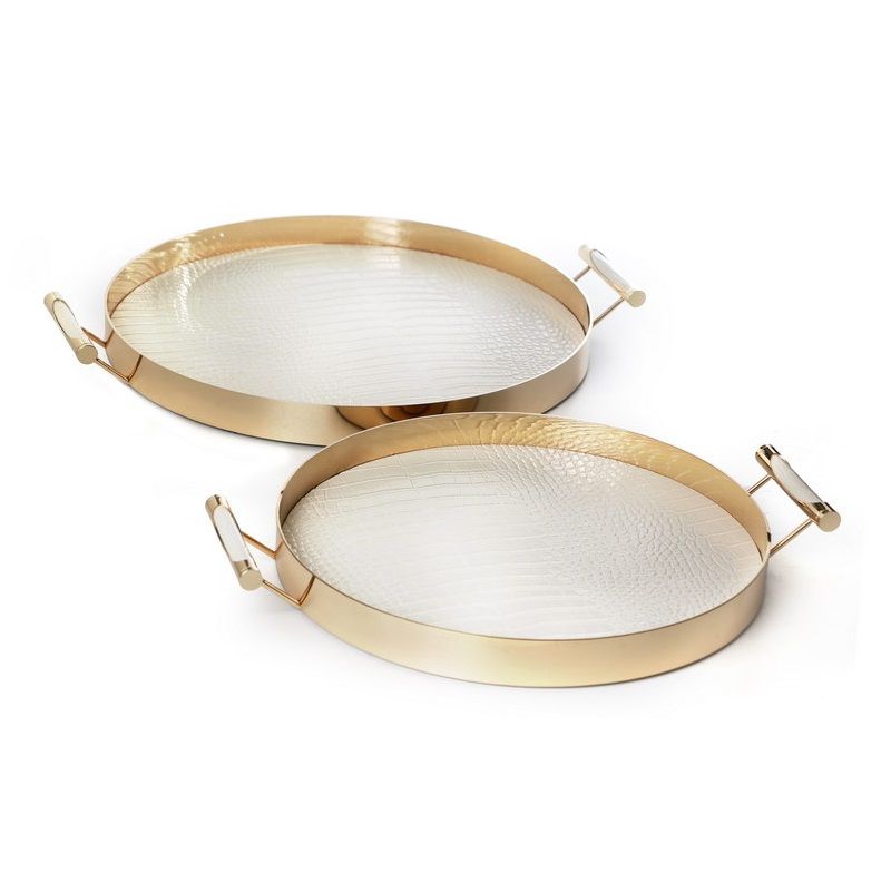 סט שני מגשים לבן PU מסגרת זהב קוטר 35/30 ס"מ