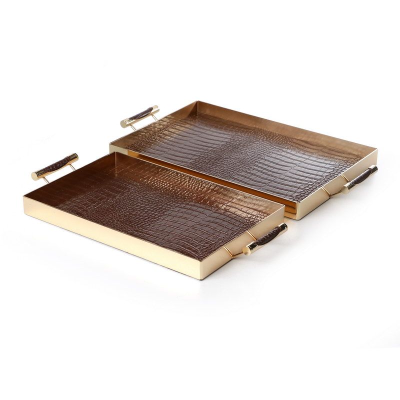 סט שני מגשים מלבניים חום PU מסגרת זהב 44/26 ס"מ 40/22 ס"מ