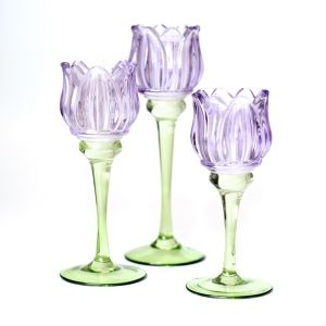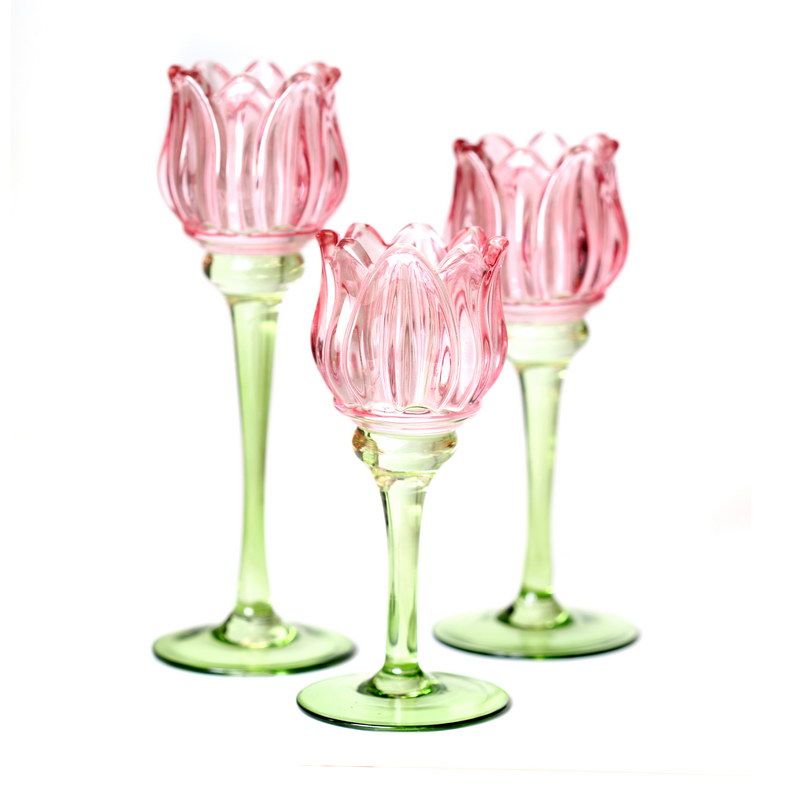 סט 3 מעמדי נר פרחי זכוכית על רגל ירוק/ורוד בגבהים 16/20/25 ס"מ - NVL
