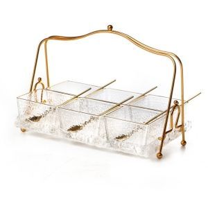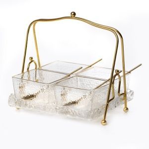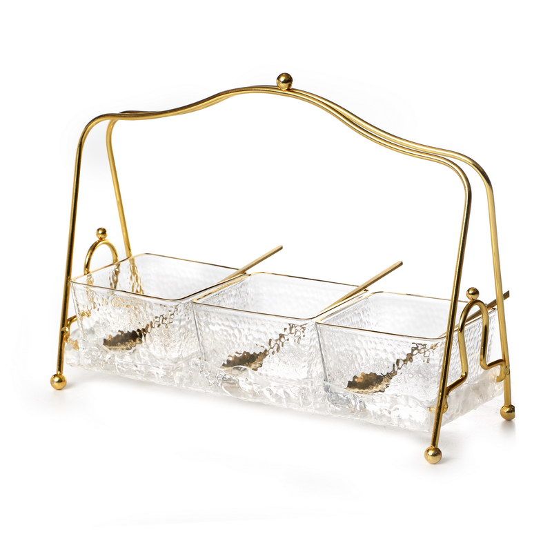 סט 3 קעריות הגשה מרובעות וכפיות על מגש זכוכית שקופה ידית נשיאה ופס זהב 30/11 גובה 21 ס"מ