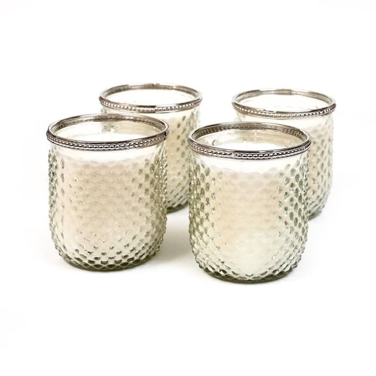 סט 4 נרות ריחניים בניחוח ונילה; בכוסות זכוכית מעוטרות וגימור מוזהב. קוטר 9.5 סמ; גובה 11 ס"מ.