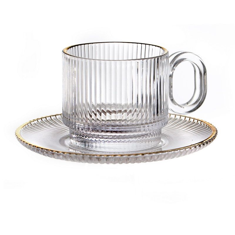 סט 6 כוסות אספרסו זכוכית פסים שקופה ותחתיות פס זהב 160 מ"ל