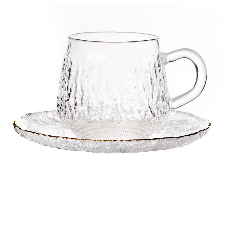 סט 6 כוסות תה זכוכית גבישי ותחתיות שקוף/ פס זהב 270 מ"ל