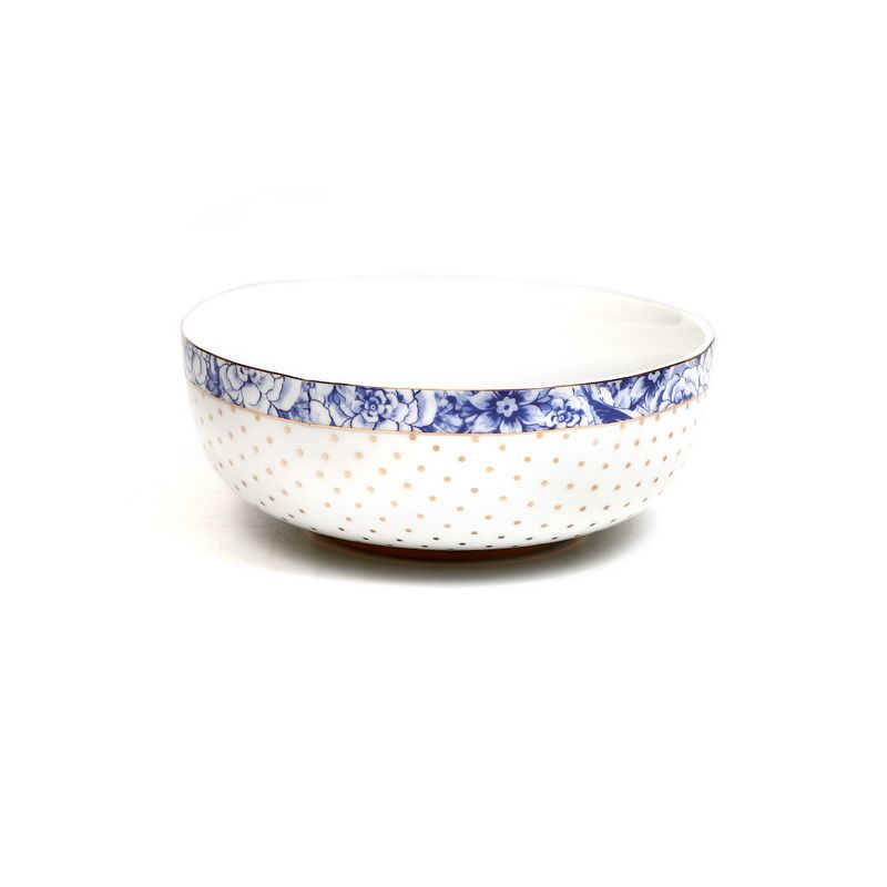 סט 6 קערות לבנות עם עיטור פרחוני כחול עדין ונקודות זהב נקי מסדרת Royal White. משמש להגשת מזון חם או קר ומתאים גם לאירוח. יכול לשמש כאקססורי לעיצוב הבית.