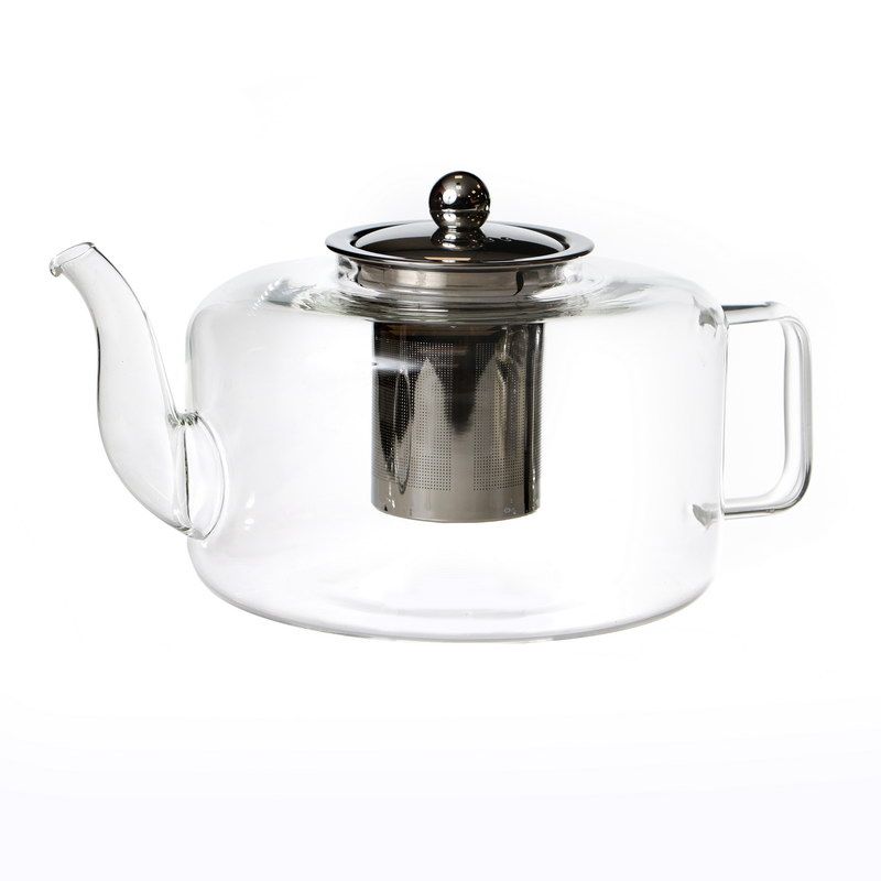 קומקום זכוכית עם מסנן נירוסטה כסוף בעיצוב נקי ומכסה מבית Cucina Mia. ניתן להשתמש להכנת חליטות תה משקאות חמים נוספים וכאקססורי לעיצוב הבית.