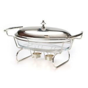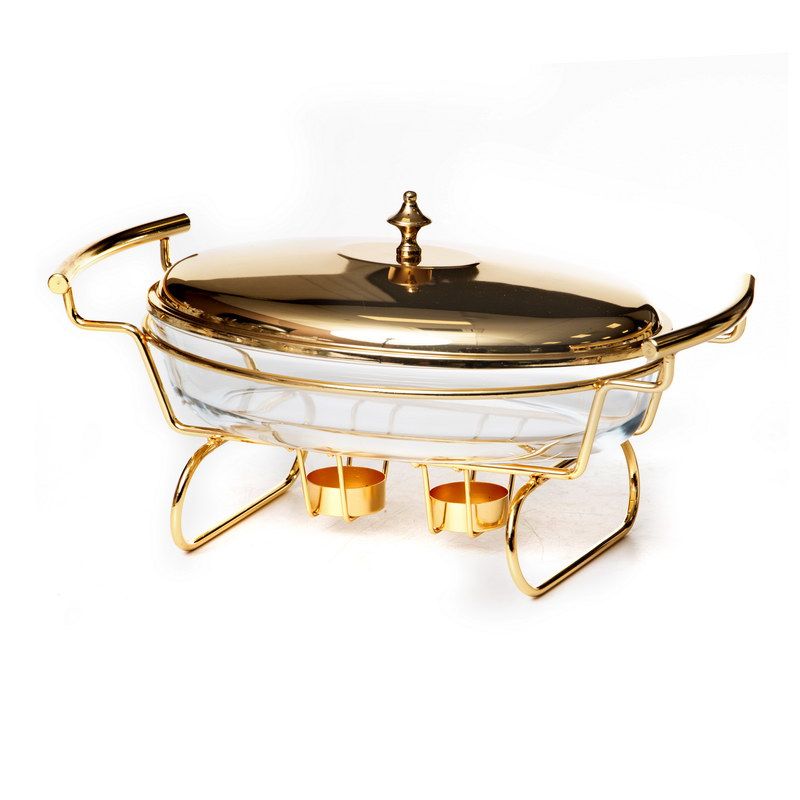 קסרולה זכוכית חימום אובלית 2.4 ליטר מכסה וסטנד מתכת זהב 39.5/21.8 ס"מ גובה 19 ס"מ