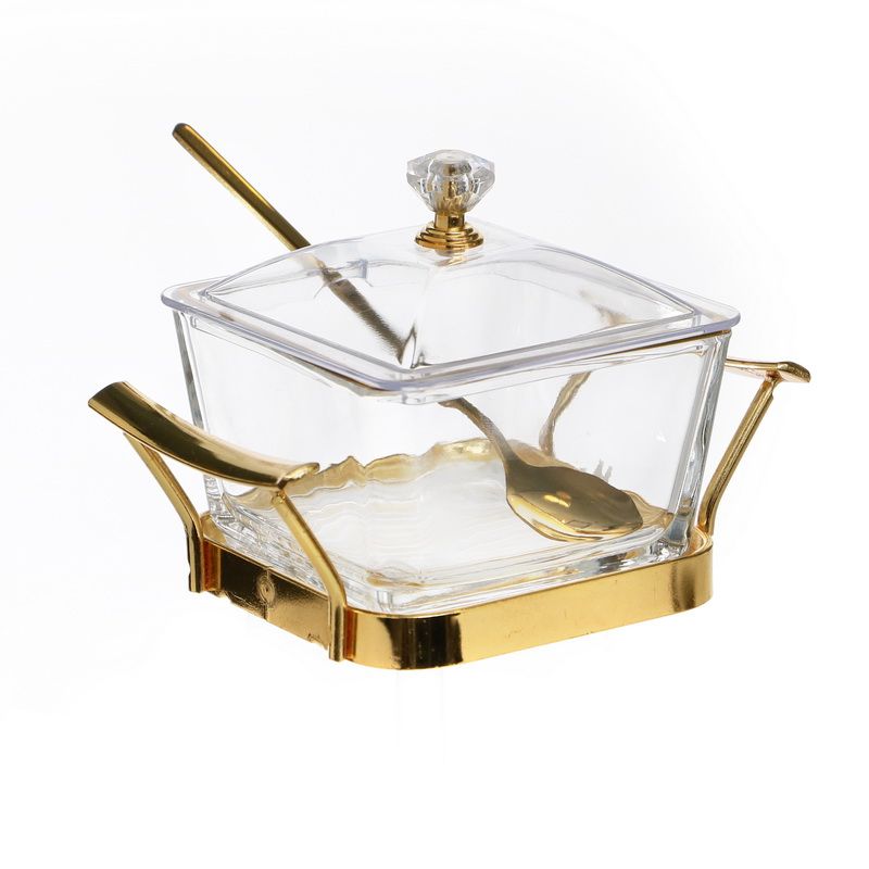 קערית הגשה מרובעת זכוכית מכסה וכפית /פס זהב 8.2/8.2 גובה 10.3 ס"מ