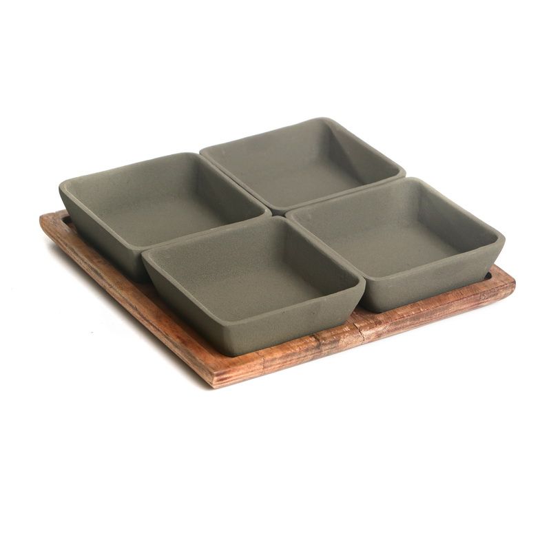 רביעיית קעריות הגשה מתכת אפורה על בסיס מרובע עץ טיבעי 24/24 גובה 4 ס"מ
