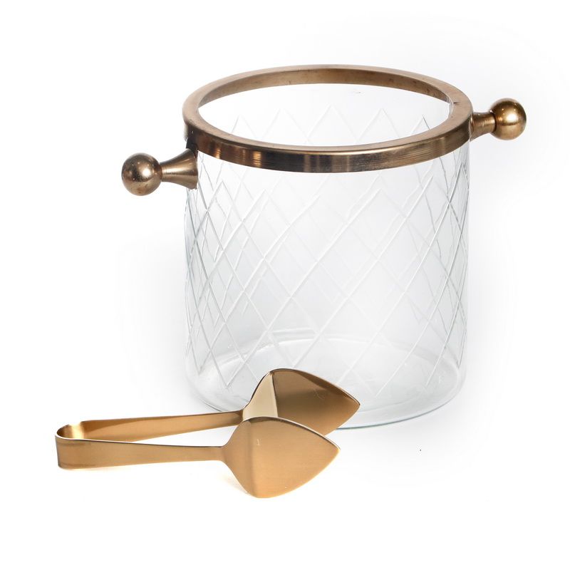 דלי קרח זכוכית ומלקחיים קצרים זהב קוטר 15 גובה 15.5 ס"מ