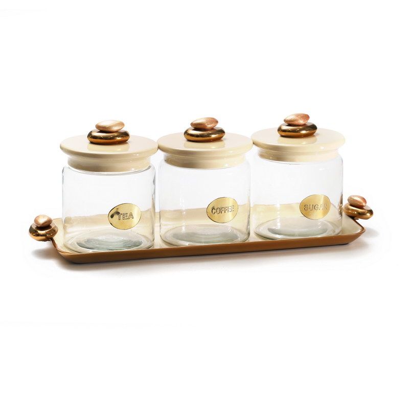 תה קפה סוכר זכוכית ומכסה על מגש בז' חלוקי נחל חום 43/16 גובה 17 ס"מ
