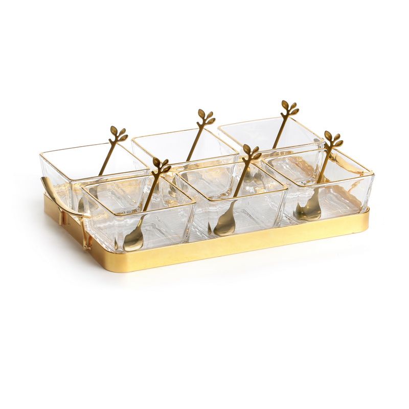 6 קעריות הגשה מרובעות זכוכית ופס זהב וכפיות ומתקן מתכת זהב 33.5/19 גובה 6 ס"מ