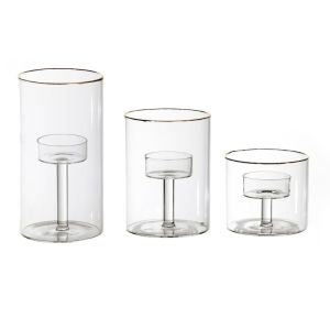 סט 3 מעמדי זכוכית שקופה לנר פס זהב קוטר 8 ס"מ וגבהים 7/11/15 ס"מ