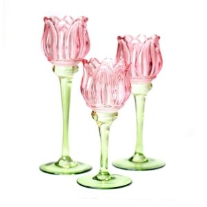 סט 3 מעמדי נר פרחי זכוכית על רגל ירוק/ורוד בגבהים 16/20/25 ס"מ