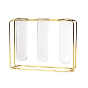 שלישייית אגרטלי זכוכית בסטנד מתכת זהב שקופה 28/7 ס"מ גובה 21 ס"מ