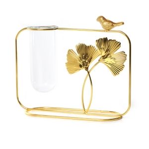 אגרטל זכוכית בסטנד מתכת עלים בזהב מלבני/שקופה 22/7.2 ס"מ גובה 18.4 ס"מ