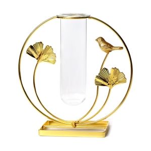 אגרטל זכוכית בסטנד מתכת עלים בזהב עגול /שקופה 18/7.5 ס"מ גובה 21 ס"מ
