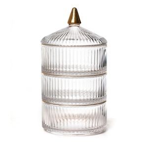 צנצנת 3 קומות זכוכית קריסטל פסים עם מכסה פס זהב גובה 24 קוטר 13 ס"מ