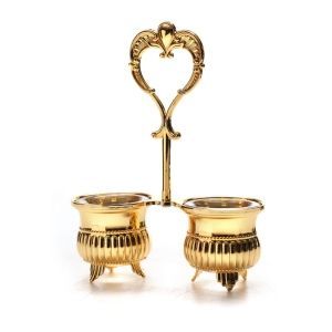 זוג מלחיות מתכת פתוחות /זכוכית שקופה ציפוי זהב פסים וידית נשיאה 12/5.3 ס"מ גובה 14.5 ס"מ